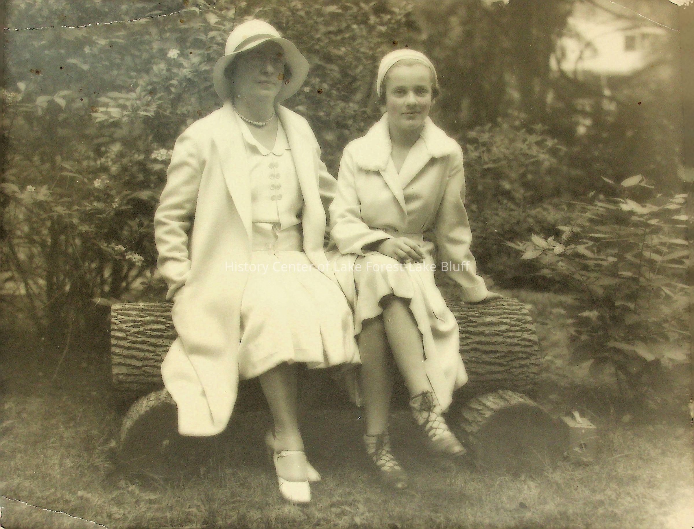 Exterior image of Florence Kimball Gourley and Margaret Gourley seated on bench wearing hats and coats (Scan bed not large enough to fit entire image; photograph is oversized)