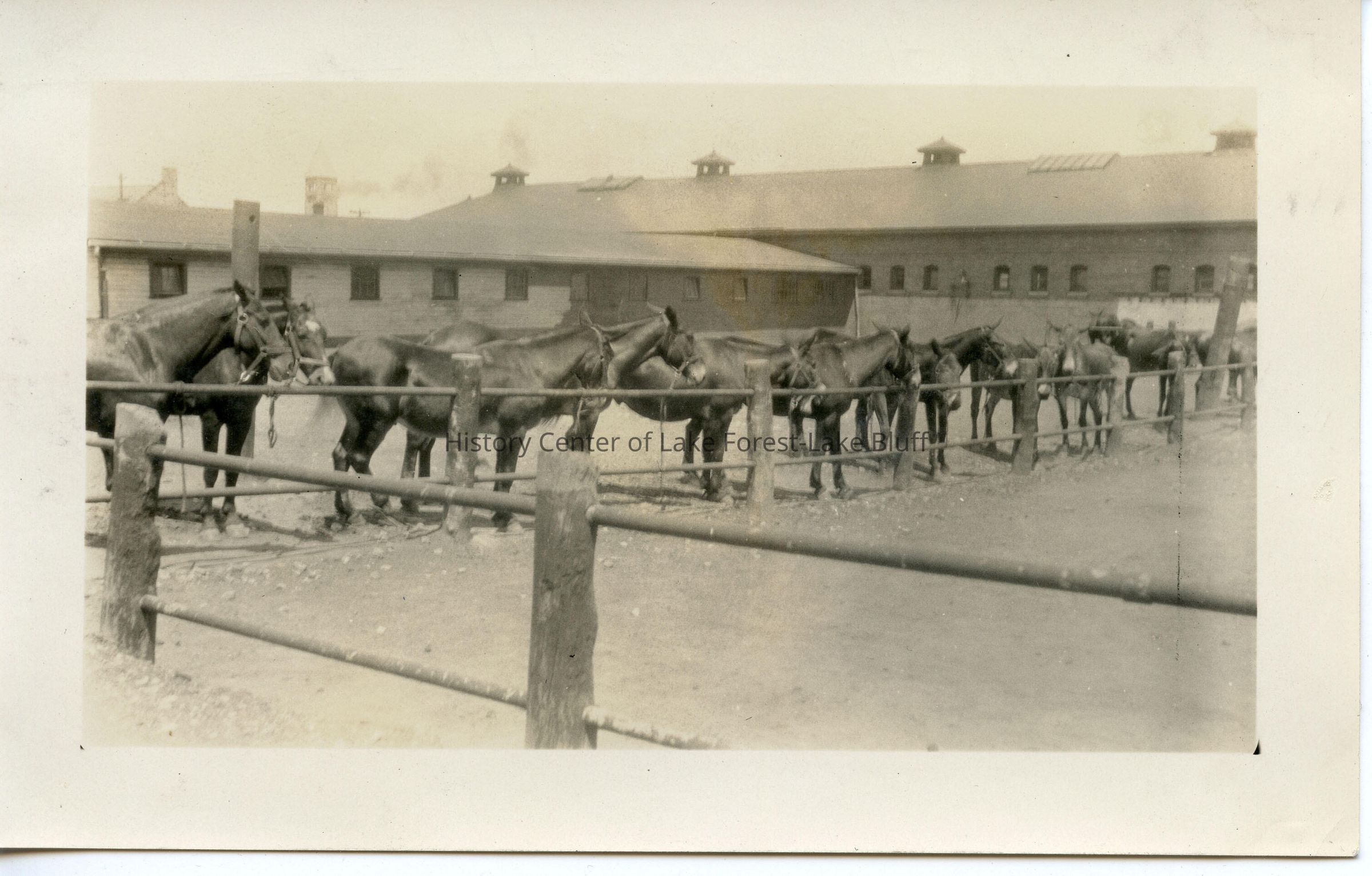 Stables and horses at Ft. Sheridan. Early 1930s. Black and white photograph.