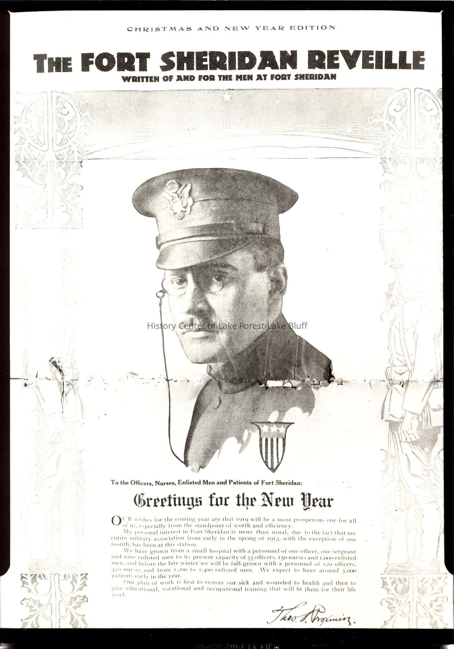 Black and white portrait of Dr. Theo S. Proxmire circa 1918. The Fort Sheridan Reveille which was written of and for the men at Fort Sheridan. Picture caption "Greetings for the New Year."
