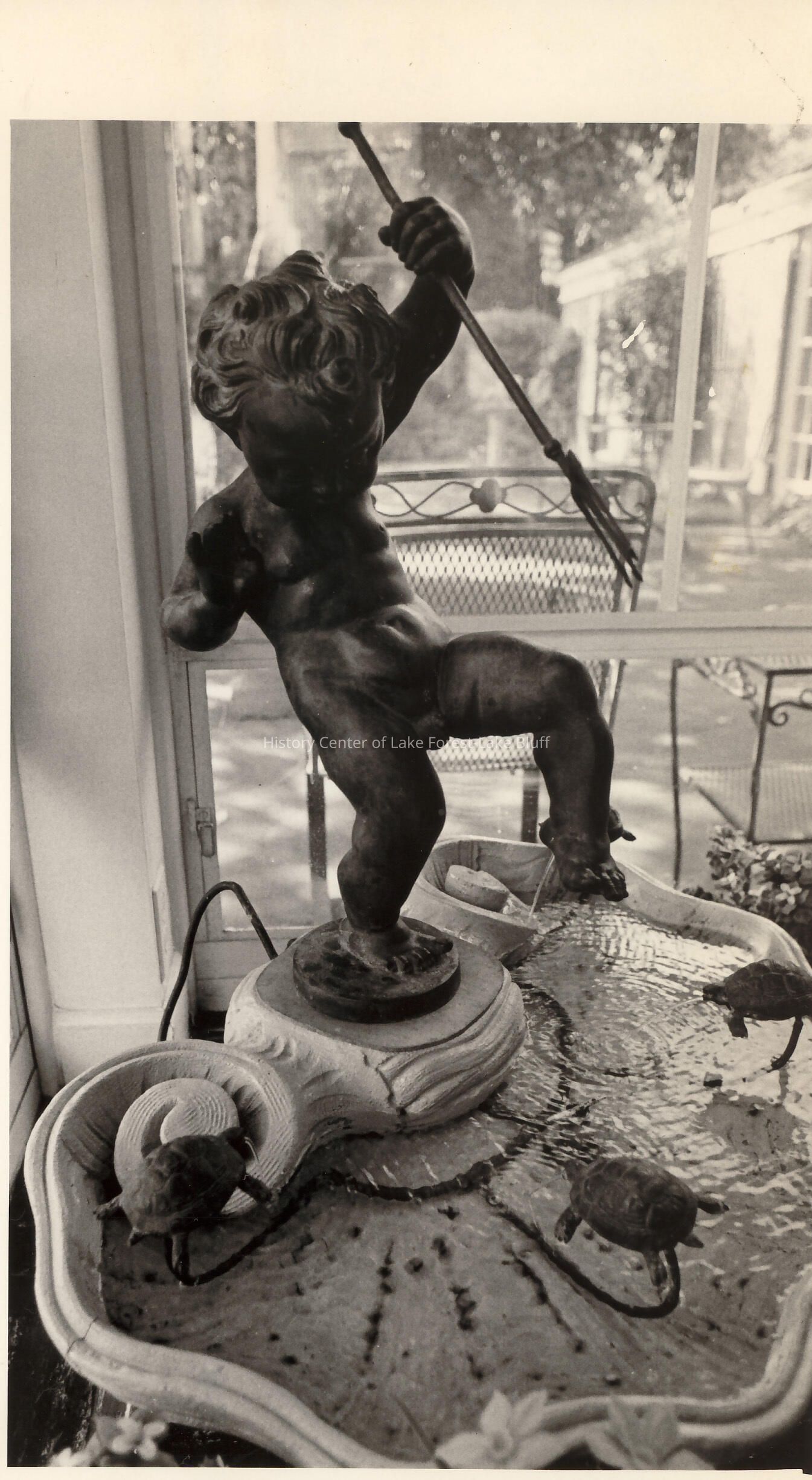 Fountain with cherub holding spear and three turtles in fountain. in the home of John O. Giles ? Mr. Giles was a Lake Forest mayor from 1948-1951