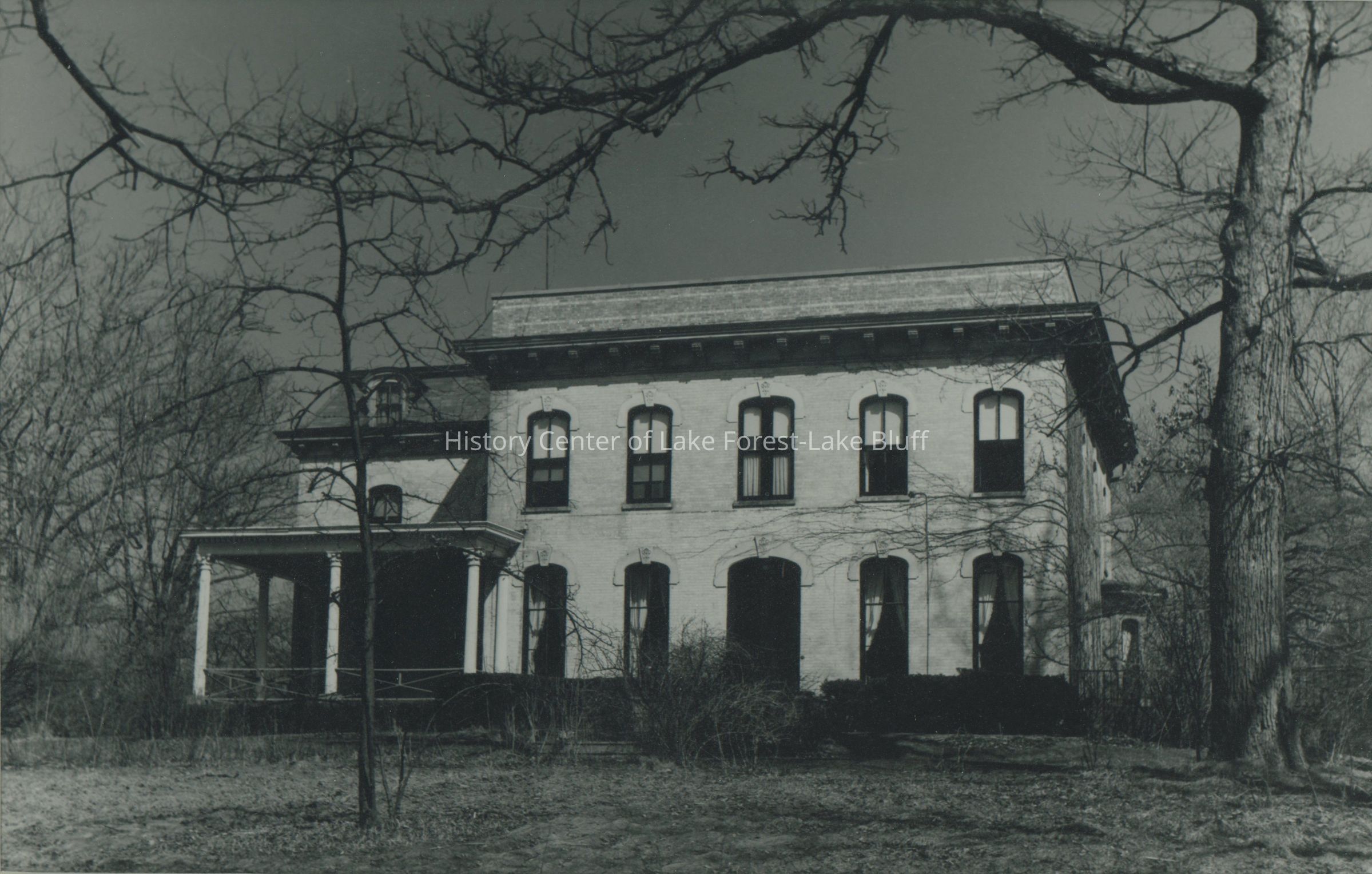 Framed, wall hanging photo of the "Baker House" by Paul Whiting. According to donor, Erica Meyer, the photo was taken in 1978. Purchased by Meyer around the time that she was a student a Lake Forest College (c. 1977). The Baker House is located at 404 E Deerpath Rd.