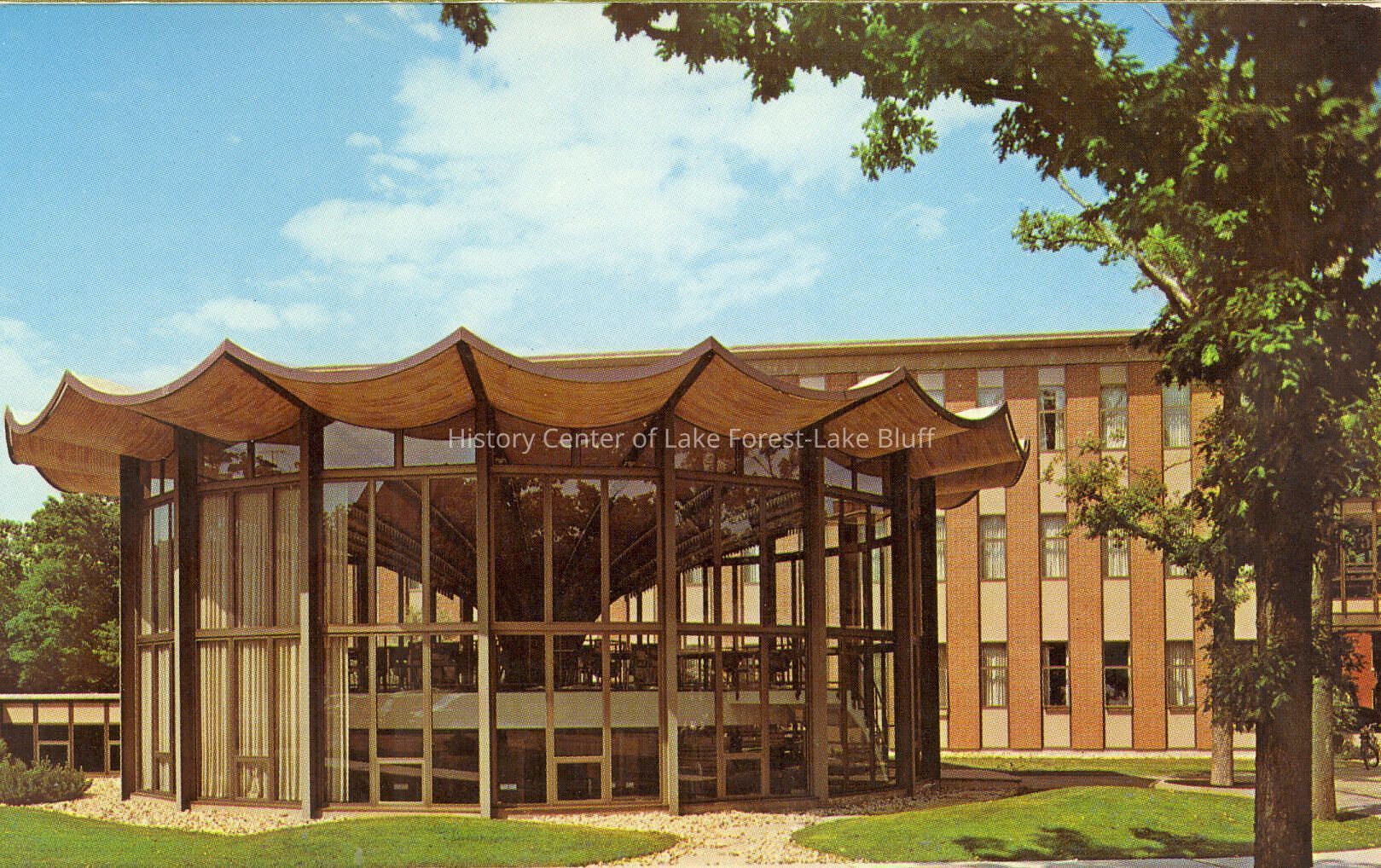 Postcard view of Freeman Memorial Science Library, located on Lake Forest College's Middle Campus. Back reads, "Built in 1962 as a memorial to Dr. Thomas Oscar Freeman, the circular Science Library is part of the three-unit Science Center. It contains some 10,000 books and journals in the natural sciences and mathematics. A reading lounge is located on a mezzanine around the perimeter of the interior, while 17 individual study carrels are located on the outer edge of the stack area at ground level. The library is connted to the adjoining laboratory building by and underground passageway, while this unit is connected to the two-story classroom building by a glass bridge."Lexicon