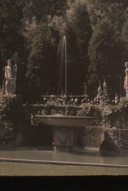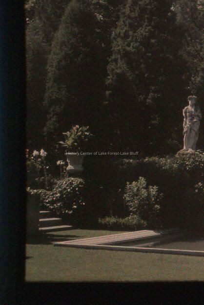 grass on a diagonal line (taken from slightly right of center) in foreground. Pond then 4 statues (with fountain in between each set of 2) trees at background. Havenwood II garden 1075 East Ringwood Road Lake Forest owners: Edward Larned Ryerson Sr. and Mary Pringle Mitchell Ryerson; Franciscan Order of Monks Howard Van Doren Shaw landscape architects: Jens Jensen; Rose Standish Nichols 1912-1914 N - razed 1979 Gatehouse extant at 955 Ringwood