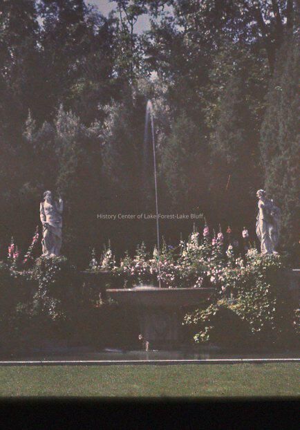 grass in foreground. Pond then 4 statues (with fountain in between each set of 2) trees at background. Havenwood II garden 1075 East Ringwood Road Lake Forest owners: Edward Larned Ryerson Sr. and Mary Pringle Mitchell Ryerson; Franciscan Order of Monks Howard Van Doren Shaw landscape architects: Jens Jensen; Rose Standish Nichols 1912-1914 N - razed 1979 Gatehouse extant at 955 Ringwood