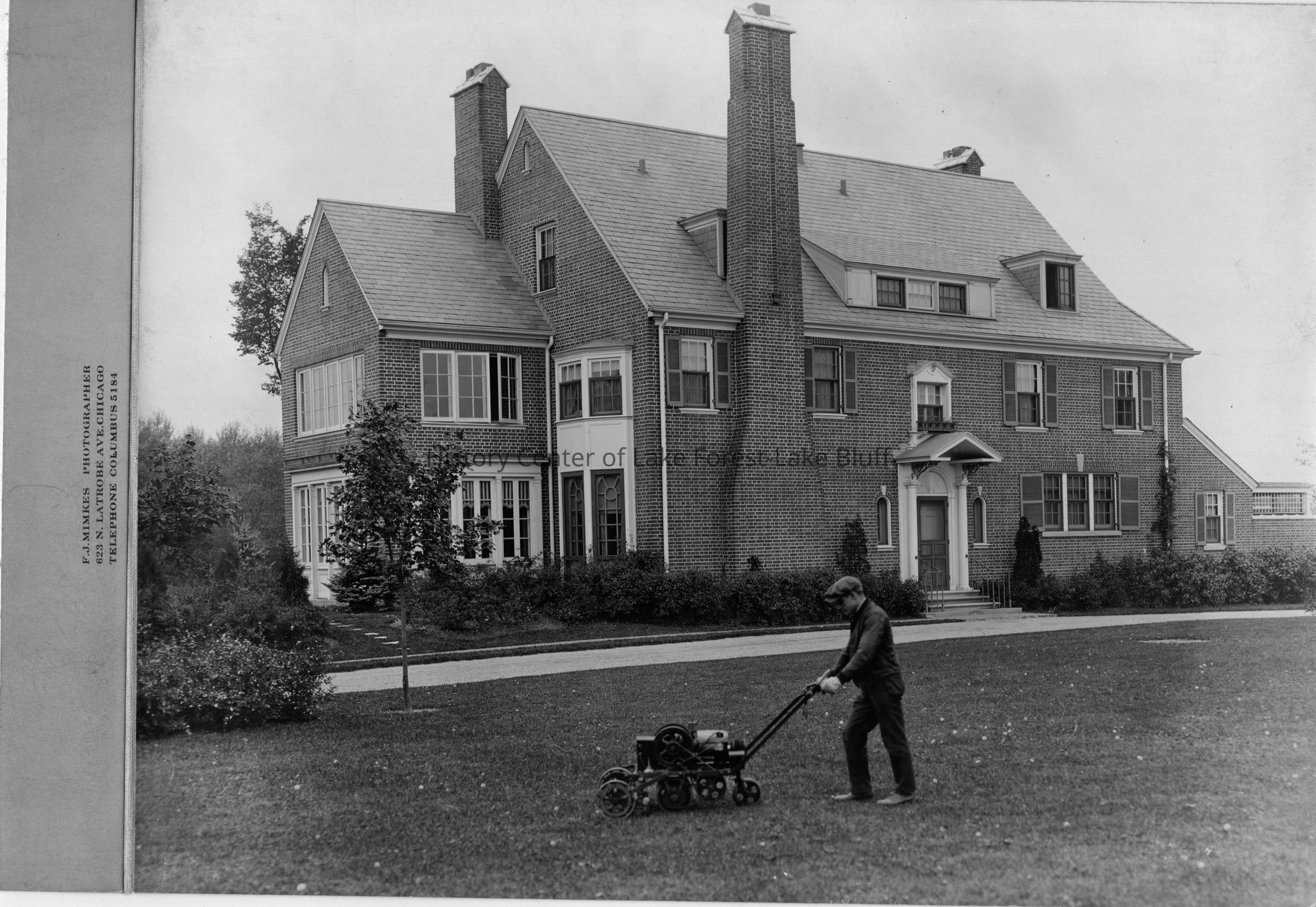 6 East Laurel Avenue, at the northeast corner of Laurel and Green Bay Road. Alfred T. and Mildred Wells Carton estate. East-facing facade of the house (so looking west). Gardener Enoch Dunn is pushing a lawnmower across the grass in the yard. C. 1920s.