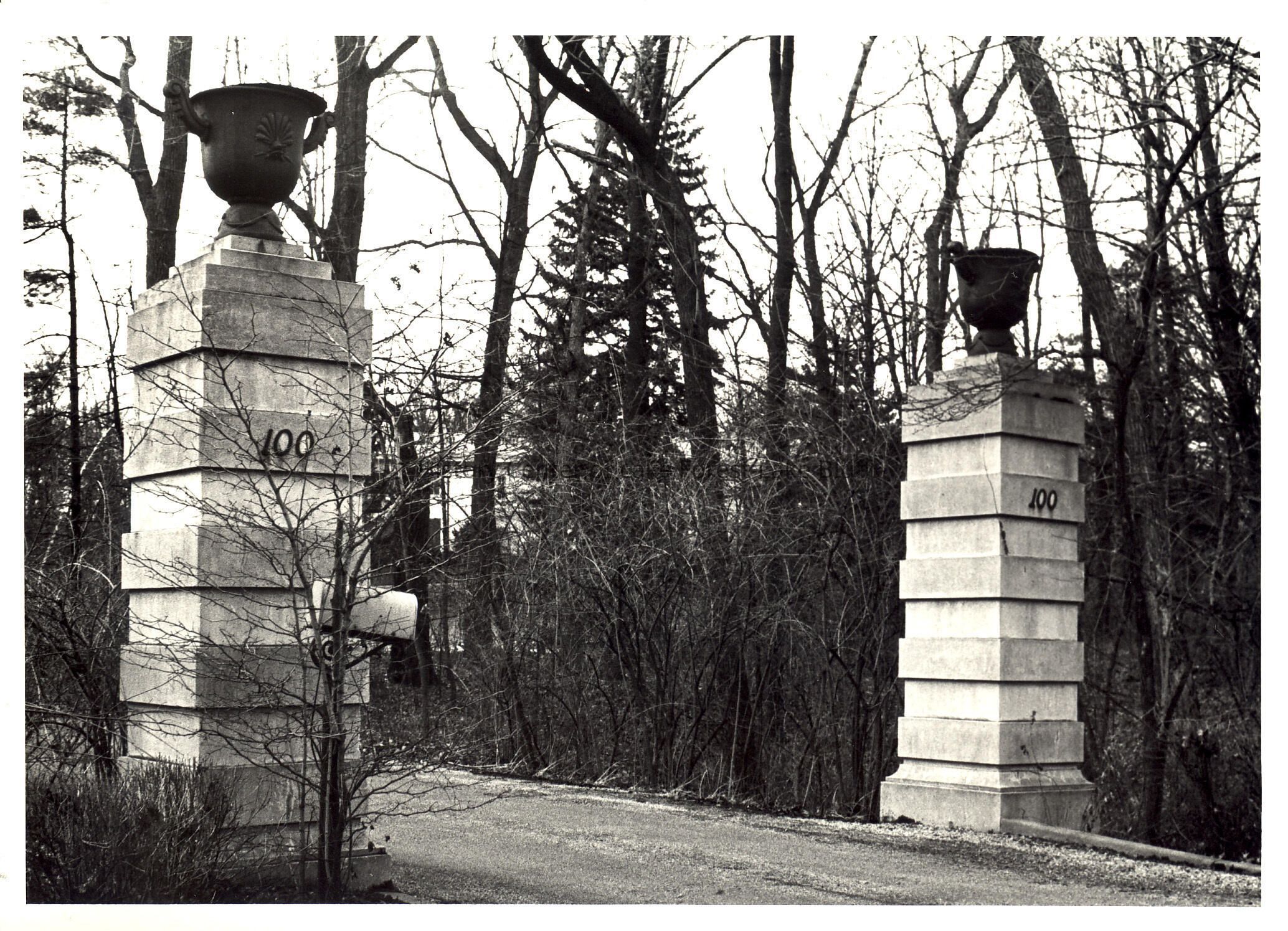 Square stone gate posts topped by urns at entrance to Thompson barn, formerly an auxiliary building on the Harvey Thompson property at 660 North Sheridan Road Harvey M. Thompson House Harvey M. Thompson; Joseph B. Durand Asher Carter 1861