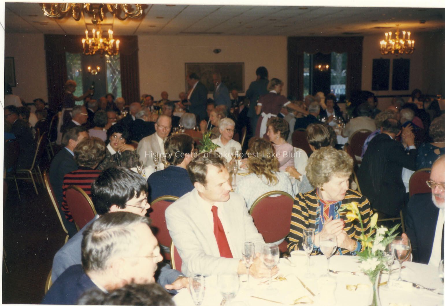 Gathering in the banquet hall at the Deerpath Inn - Virginia Fiester Frederick is in bottom right corner of photo. Dated October 1987