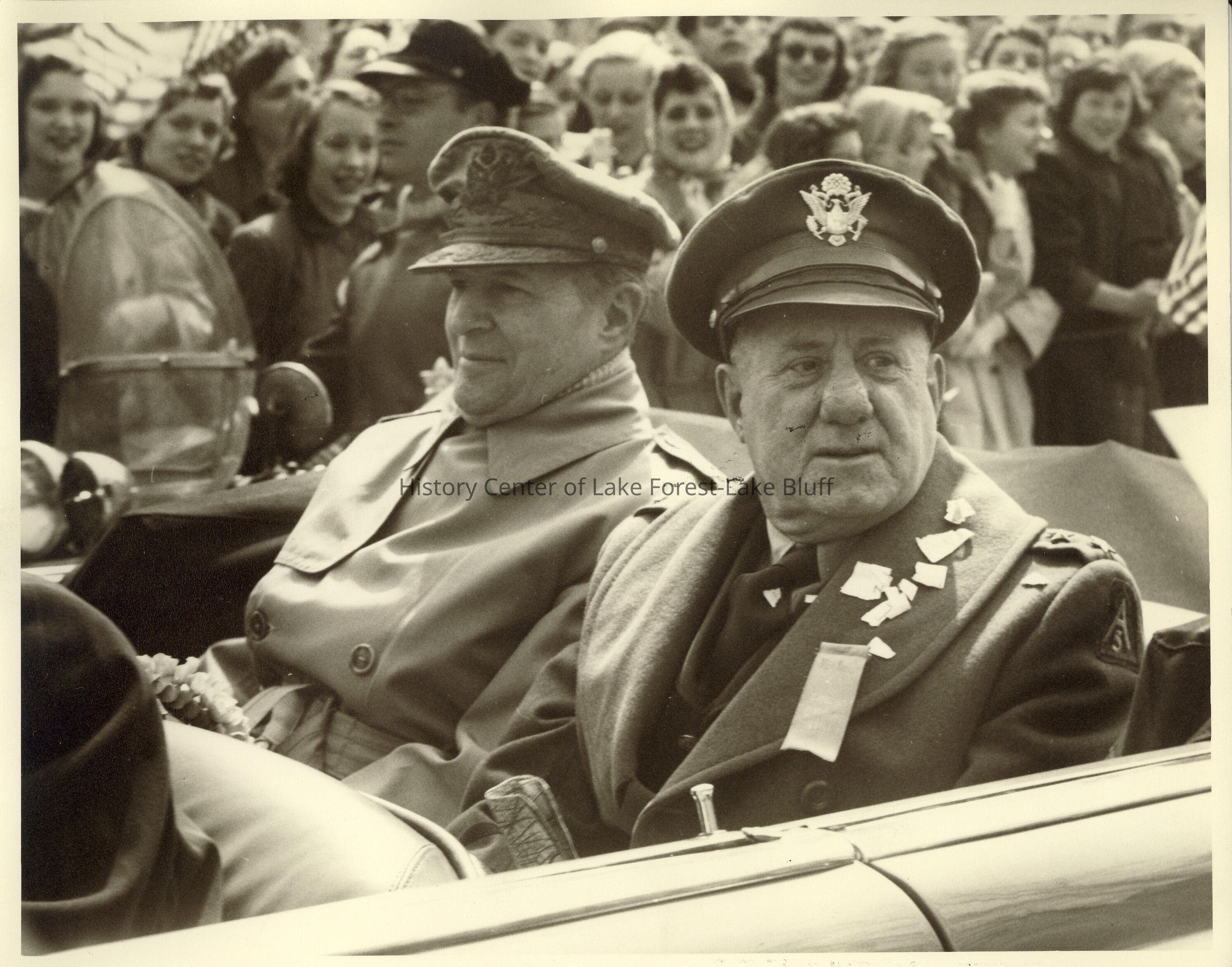 General Douglas MacArthur, driving through Lake Forest on his way to Milwaukee in April, 1951. MacArthur is at left; (unnamed) commander of Fort Sheridan is at right. See Lake Forester, 4/26/1951.