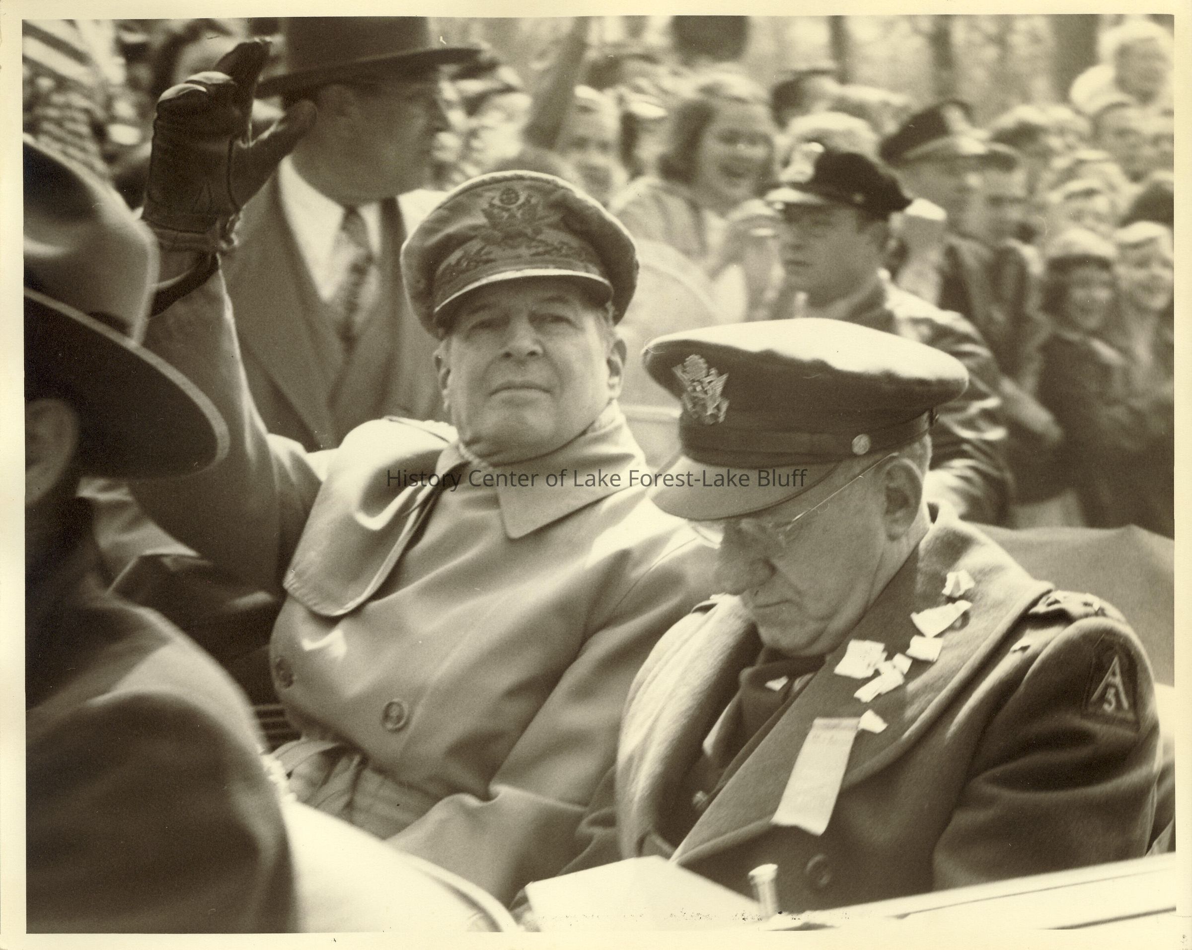 General Douglas MacArthur, driving through Lake Forest on his way to Milwaukee in April, 1951. MacArthur is at left; (unnamed) commander of Fort Sheridan is at right. See Lake Forester, 4/26/1951. Identical shot to 2010.13.68.