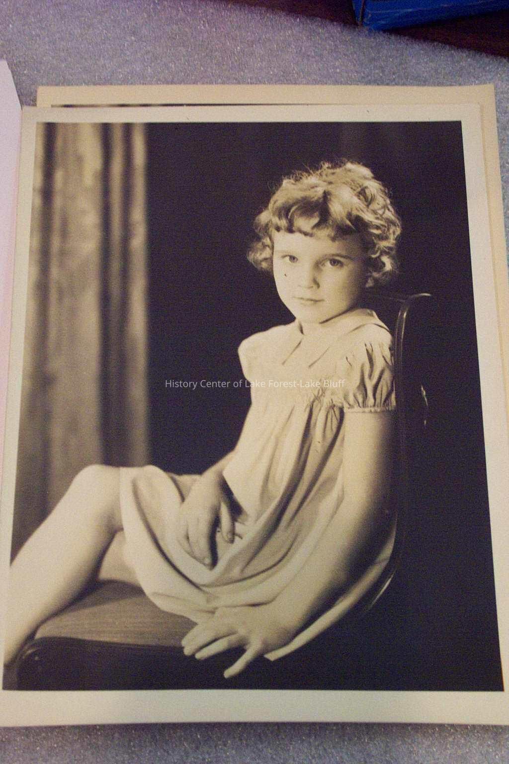 Portrait of girl (8 years?) seated in chair, hands on lap with curtains framing edges of the image. see also 2002.22.165