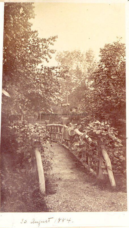 Dated 30 August 1884. Rose or Grace Farwell on bridge at Fairlawn (probably Rose).