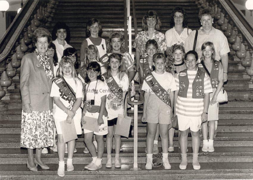 Virginia Fiester Frederick posing with Girl Scouts and leaders.