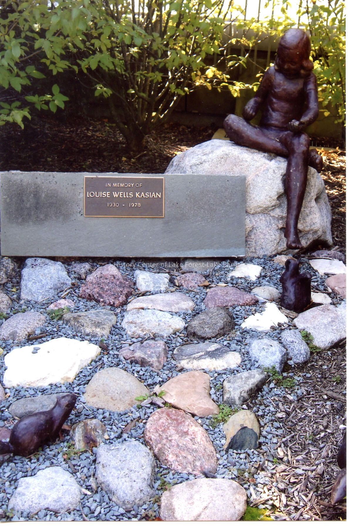 East side of Lake Forest Library. Taken October 8, 2011. Girl with a squirrel statue. Dedication plaque "In Memory of Louise Wells Kasian" former librarian.