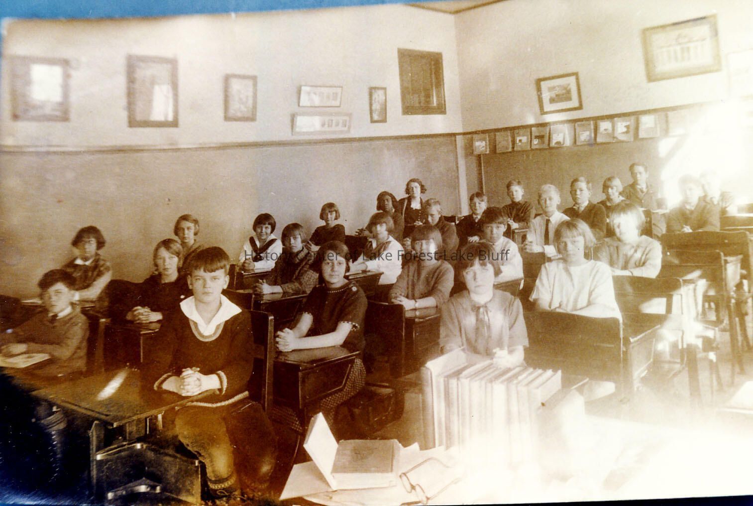 Grade 6, Gorton School, 1924-1925. Olive Morse was the teacher. Students are seated in rows in their desks. Sunlight is streaming in through window, fading out the right side of the photograph.