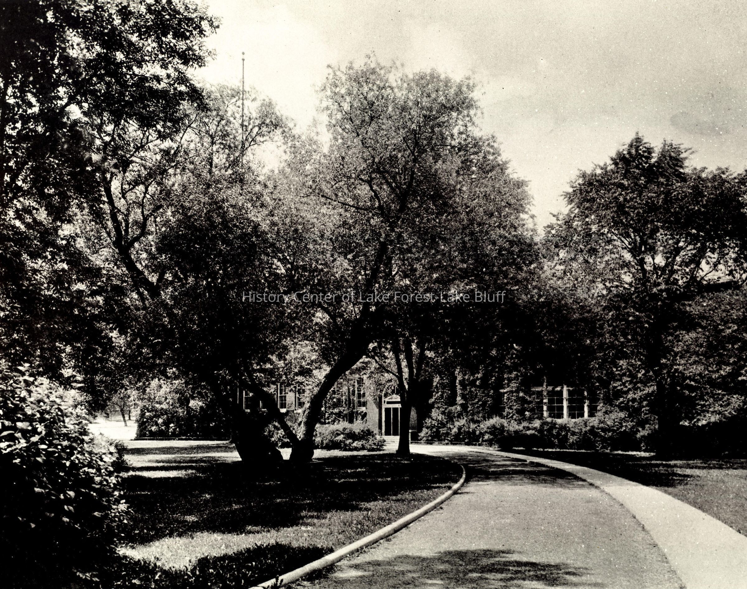Black and white 8 x 10 photograph of Gorton School exterior drive and front trees.