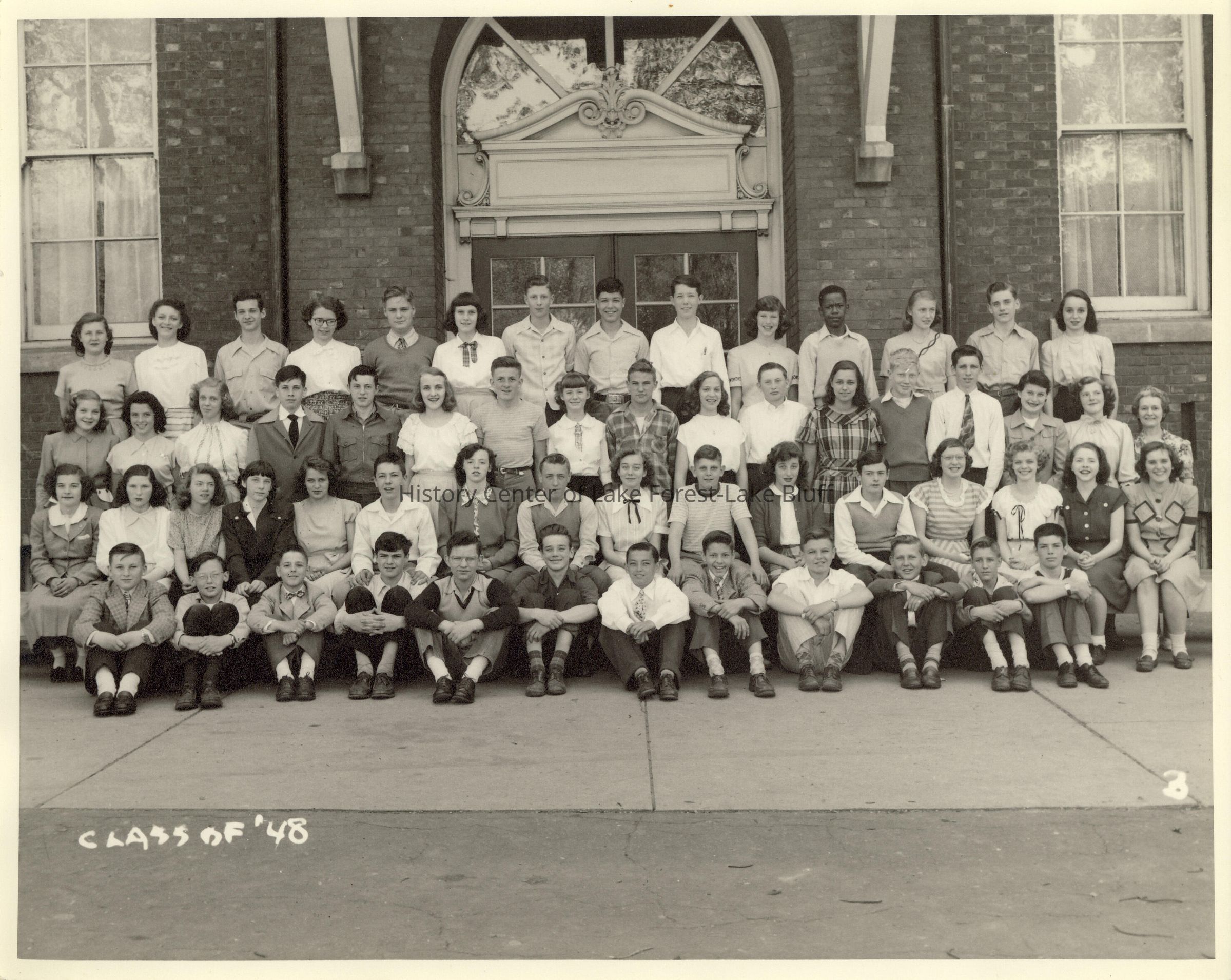 Class photo of Gorton School (8th grade) class of 1948 taken in front of school.