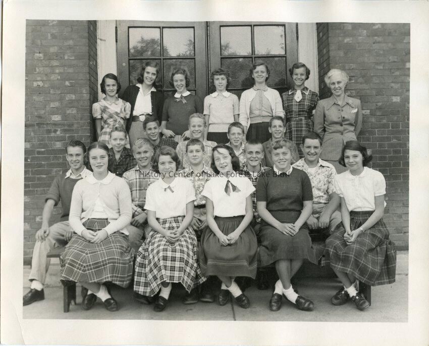 Gorton School Eighth Grade 1952-1953. Same class and taken same day as 2013.21.17. Teacher is probably Miss Hayward. David O'Neill is pictured, seated first from right in the second row. Other students unidentified.
