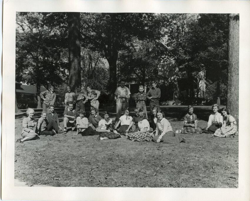 Class at Gorton School. Probably 8th grade, 1952-1953. Teacher is unidentified but looks like Miss Hayward. David O'Neill is probably pictured, standing at center in the light short-sleeved patterned shirt. One of the girls is holding a dog.