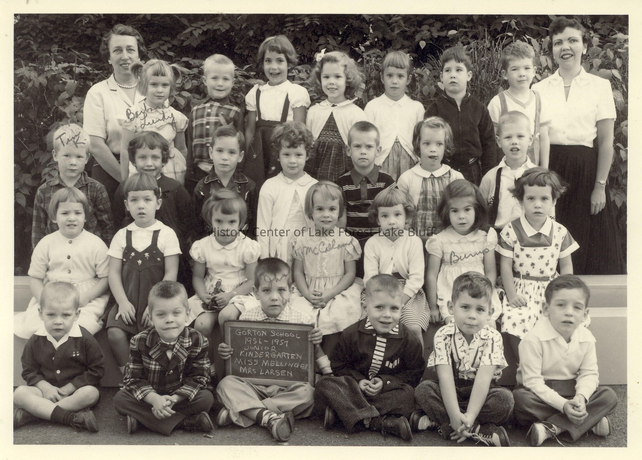 Class Photo Gorton School Junior Kindergarten with Mrs. Larsen (top left) and Miss Mellinger (top right) 1956-1957 Class Photo given by Margaret Sneddon Larsen