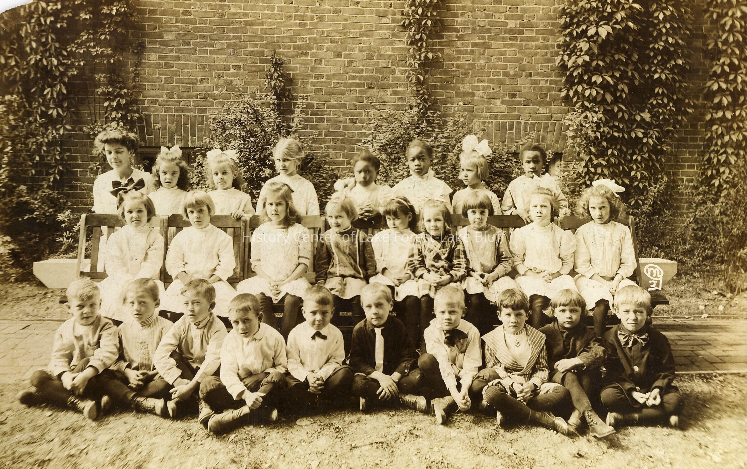 Sepia toned black and white sepia toned photograph of Gorton School class photo, circa 1920s. Francis Kerrigan is in the front row wearing the striped coat (born 1906). Possibly 5 years in photograph.