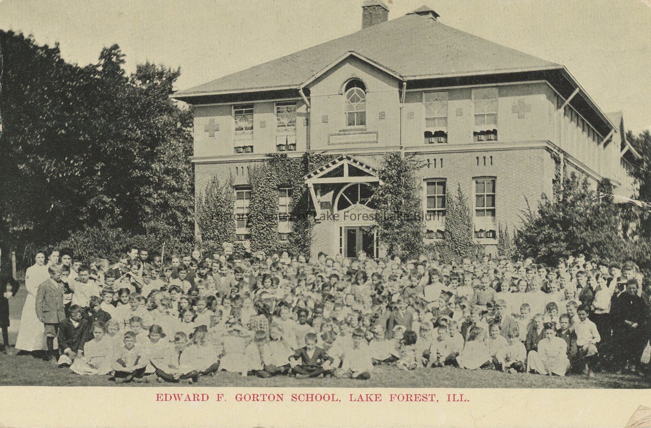 A large group of students gathers in front of the Edward F. Gorton School in Lake Forest, Illinois.