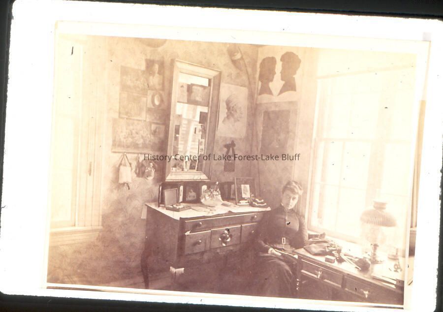 Unidentified interior, with Grace Farwell seated