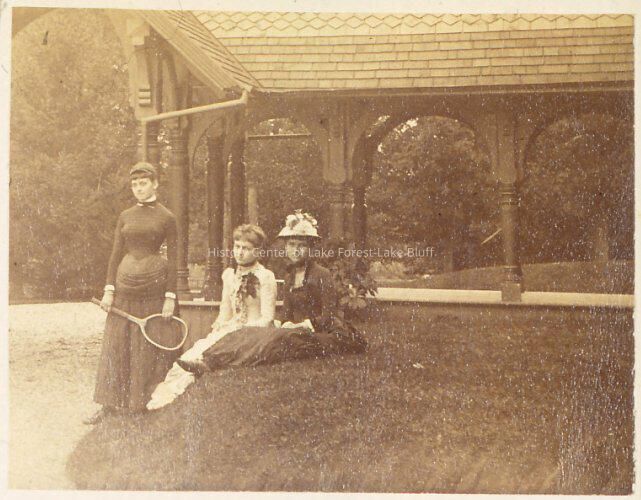 Rose or Grace Farwell (left) and two others outside, holding a tennis racket.