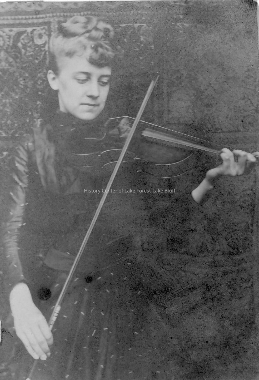 Farwell Family - mostly 1880's Woman (Grace Farwell?) playing a violin, facing the front. Photo is black/white with silver finish. drawings on back of photo