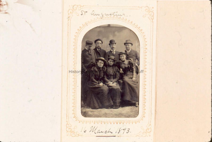 Dated March 1893. Image of four men and three women, including Grace Farwell Winston, in St. Augustine.