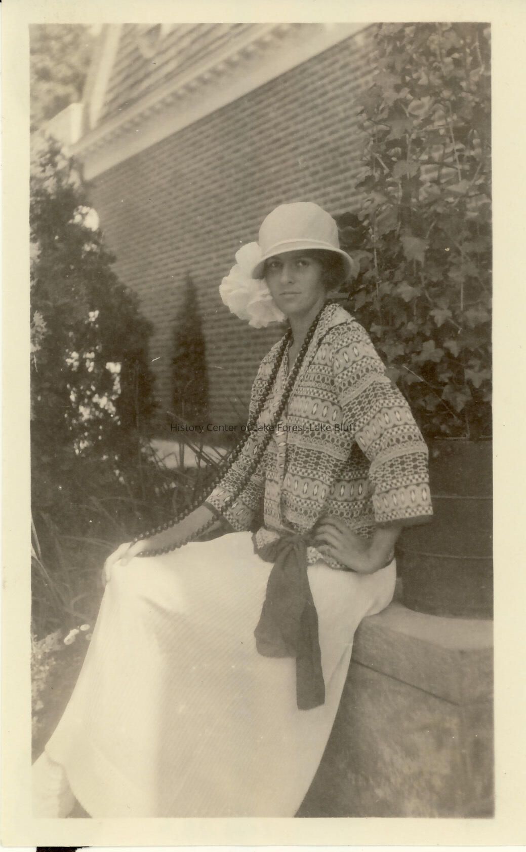 Grace McGann, later Mrs. James Douglas, sitting in the garden on a low wall. She is wearing a white skirt, patterned sweater, a hat, and long beads. There is an accompanying negative. Fairlawn 965 E. Deerpath