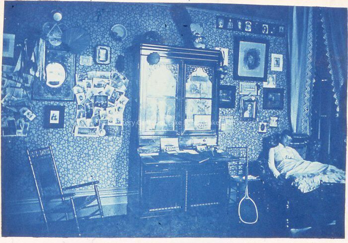 Grace or Rose Farwell sitting in room with desk/cabinet, many photographs, tennis racket.