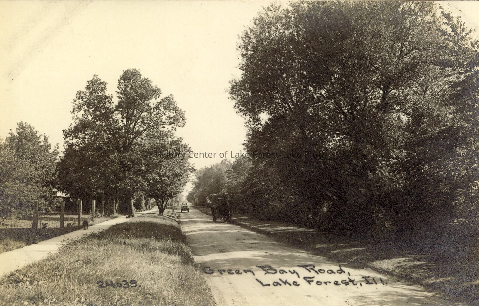 Postcard view of Green Bay Road in the early 1900s. Two cars are visible traveling opposite directions. Road is unpaved and lined with trees. A sidewalk runs down one side of the road.