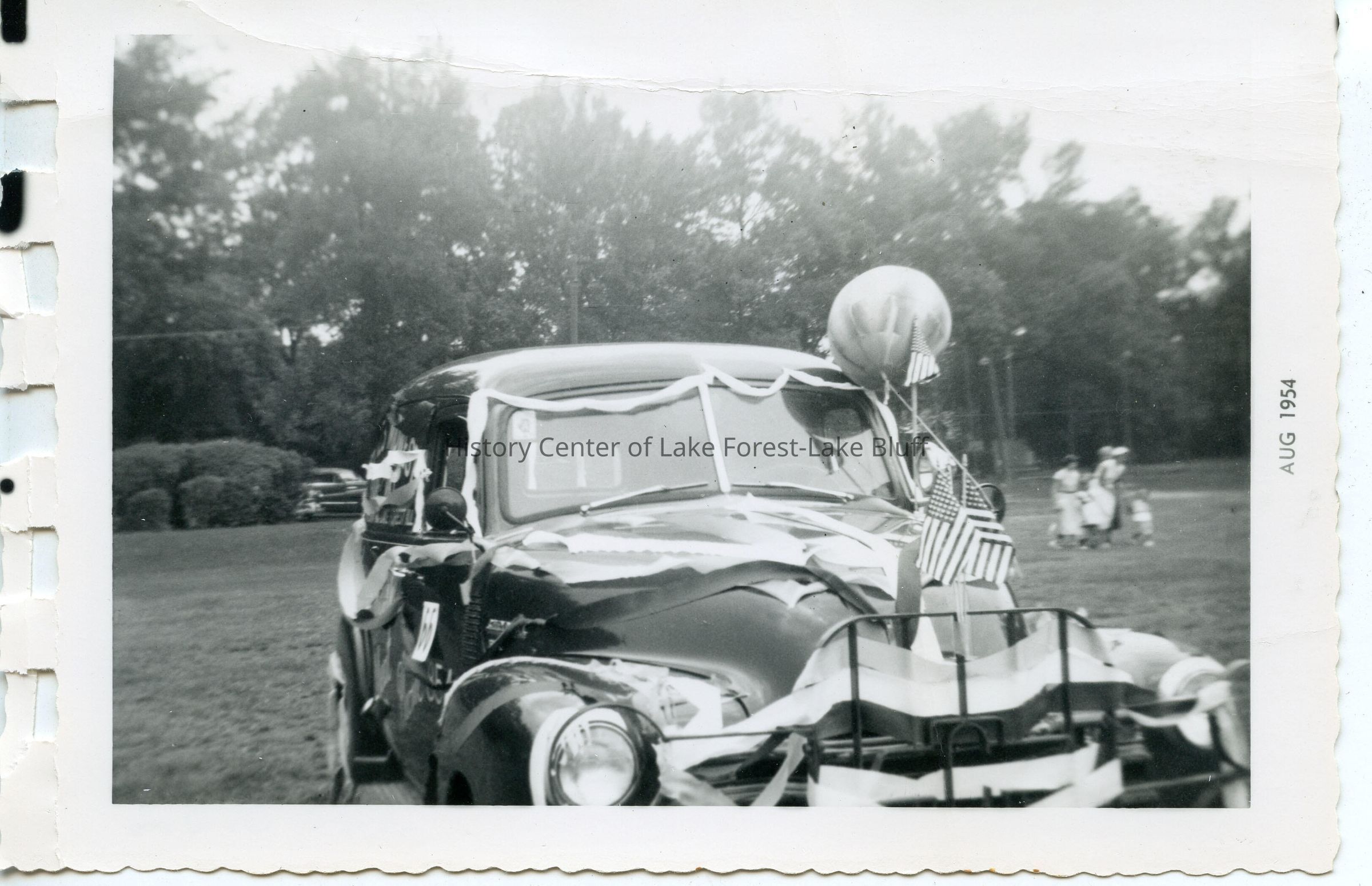 Black and white photo. Close up of Greene's Midwest Store and Market Delivery Van decorated for the 1954 Lake Forest Day parade. The store was owned by Mathilda Zieman Greene and Earl J. Greene.