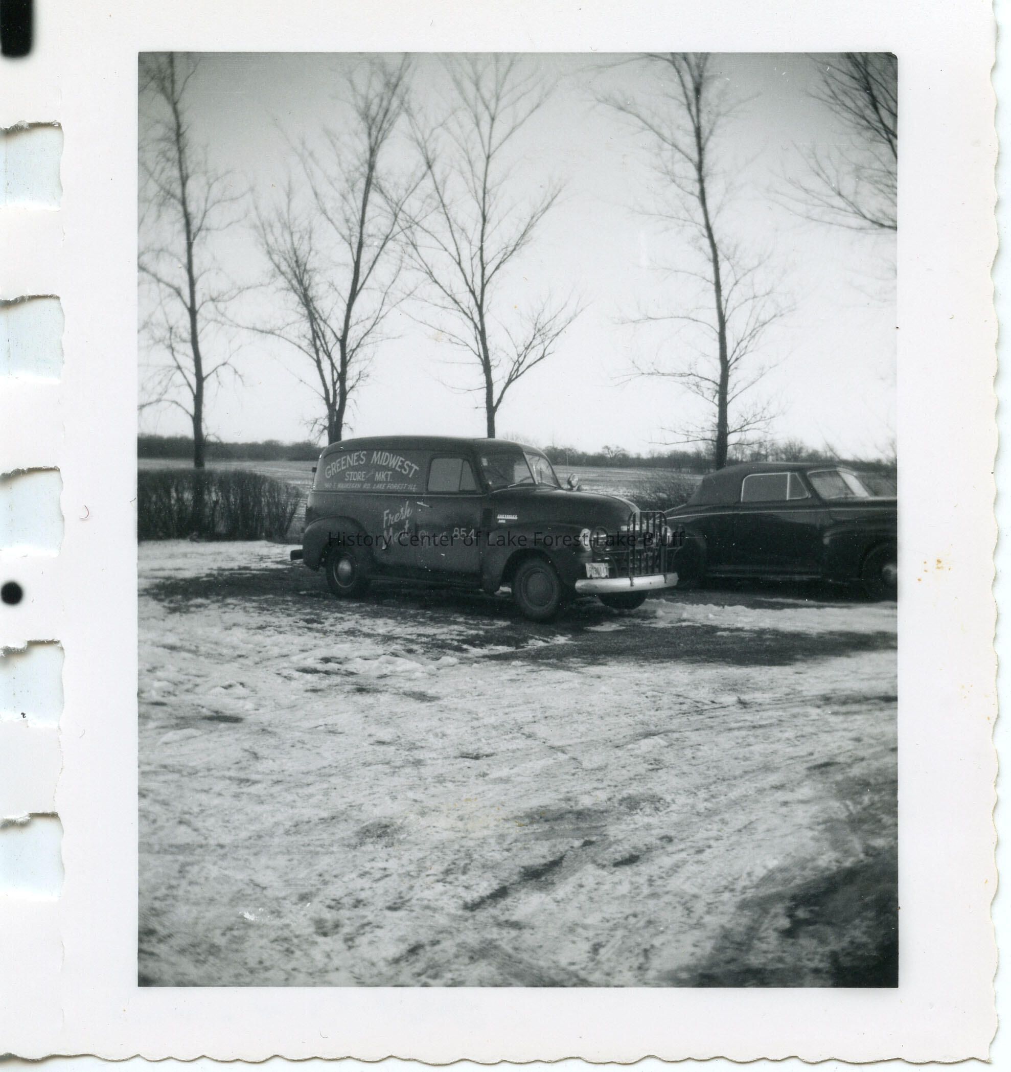 Black and white photo. Greene's Midwest Store and Market delivery van parked in winter. Address and phone number of store visible on side of van. The store was owned by Mathilda Zieman Greene and Earl J. Greene.