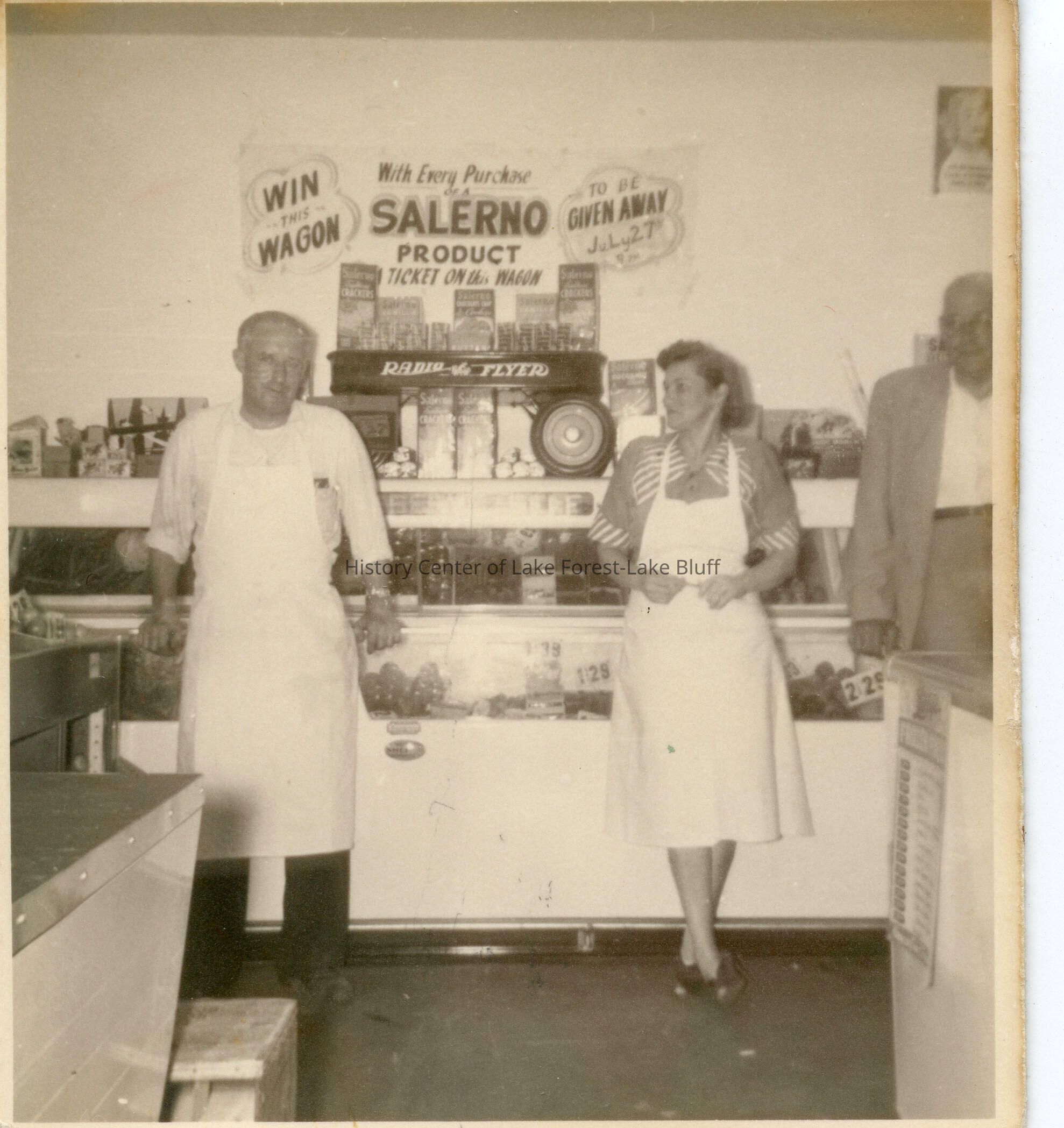 Earl J. Greene, Mathilda Zieman Greene, and an unidentified man standing in front of grocery case at the Greene's Midwest Store and Market. The store was owned by Mathilda Zieman Greene and Earl J. Greene. Black and white photo.