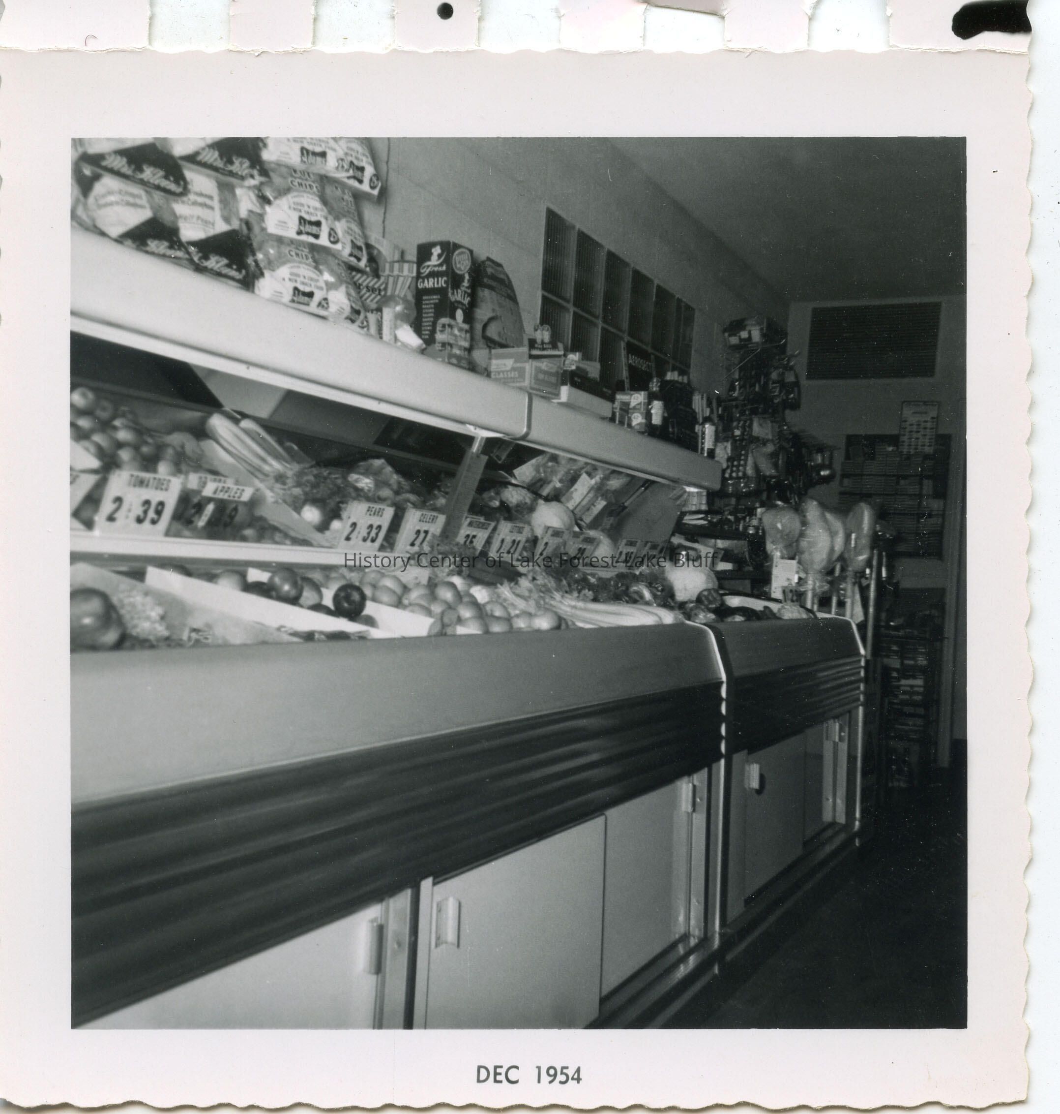 Black and white photo. Produce case at Greene's Super Mart or Greene's Midwest Store and Market. The store was owned by Mathilda Zieman Greene and Earl J. Greene.