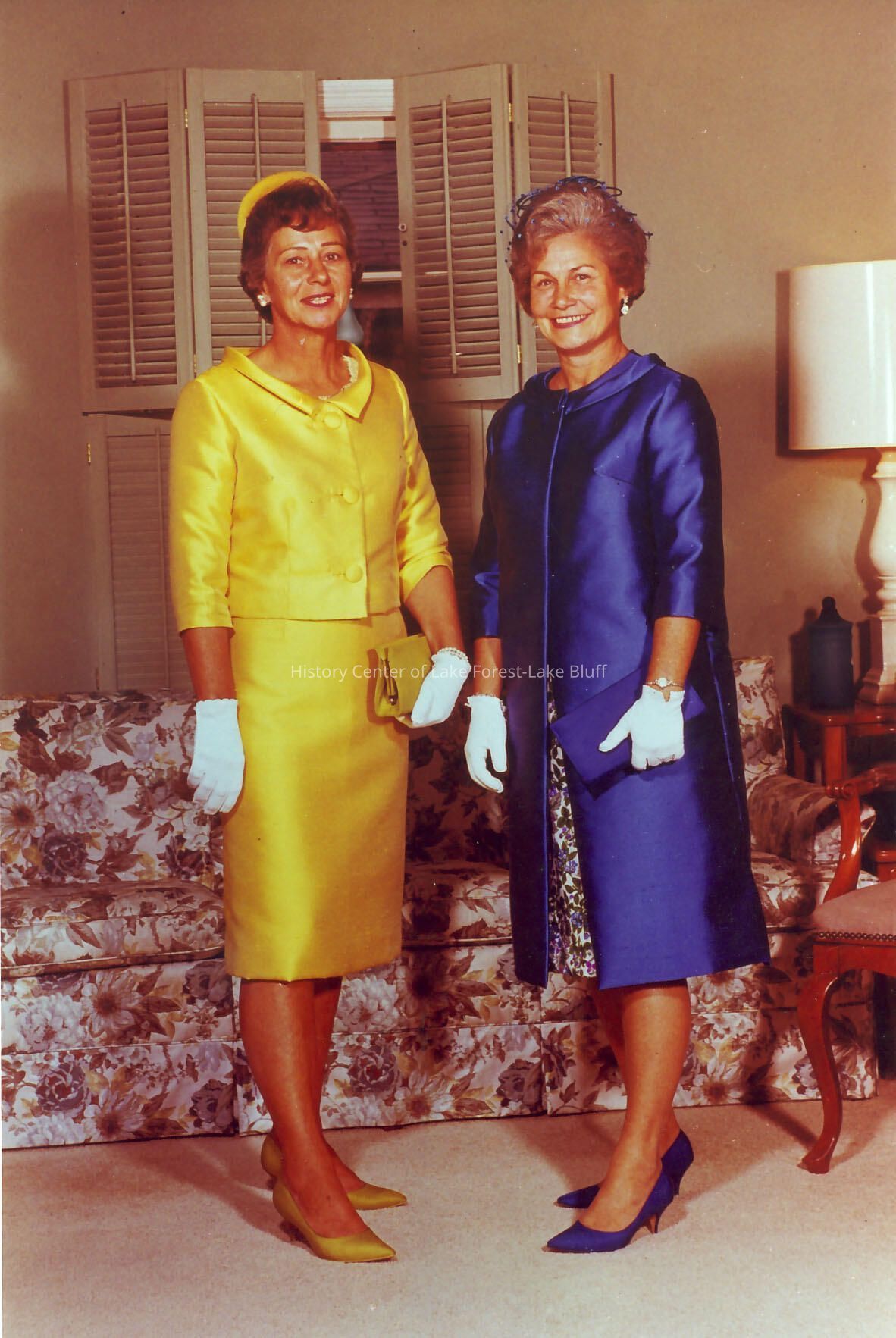 Woman on left in yellow is Mrs. Walter Benson, on right in blue is Mrs. Lloyd Lindemann