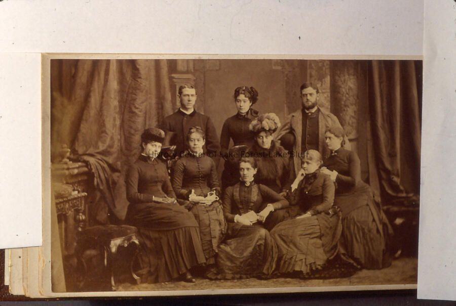 Unidentified group, 7 women and 2 men - including Grace Farwell in middle. Could it be a high school or Lake Forest University class?