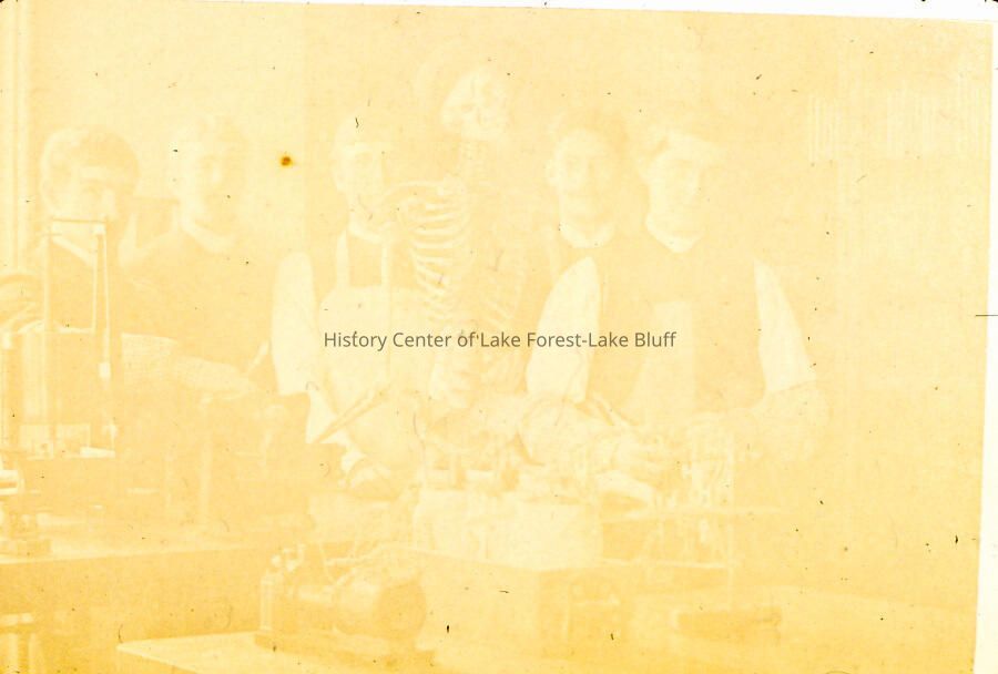Five young men with an anatomy skeleton, possibly in a science class or laboratory. Very faded. Including Dudley Winston?