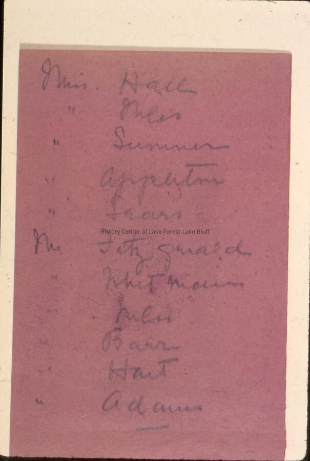 Others include: Miss (or Mrs?) Hall, Summers, Appleton, Sears. Mr. Fitzgerald, Whitman, Barr, Hart, Adams.Photograph Details