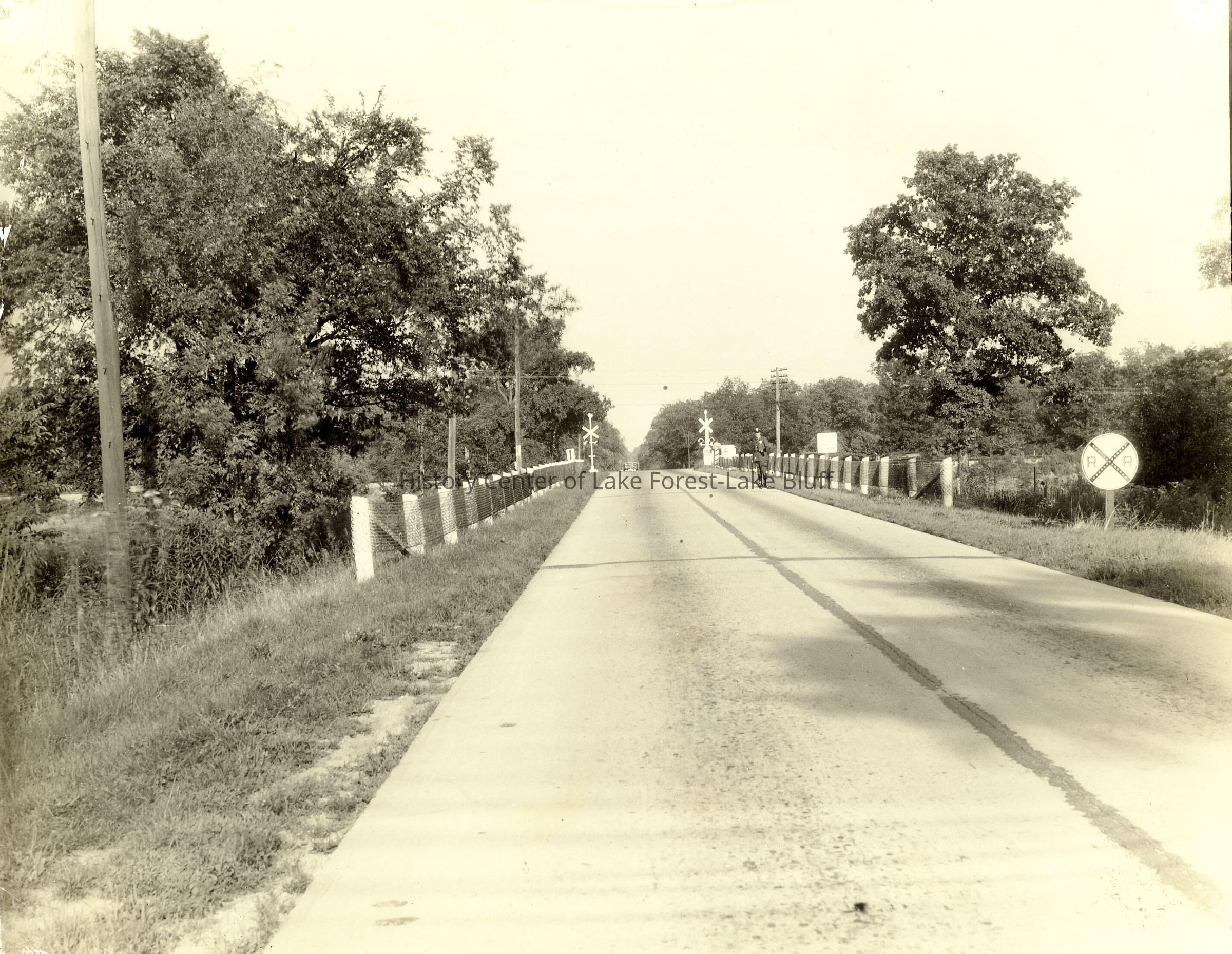 Half Day Road, looking east, crossing over the railroad tracks near the intersection with Waukegan Road. 1930s. Same view as 2005.66.85 but further west.