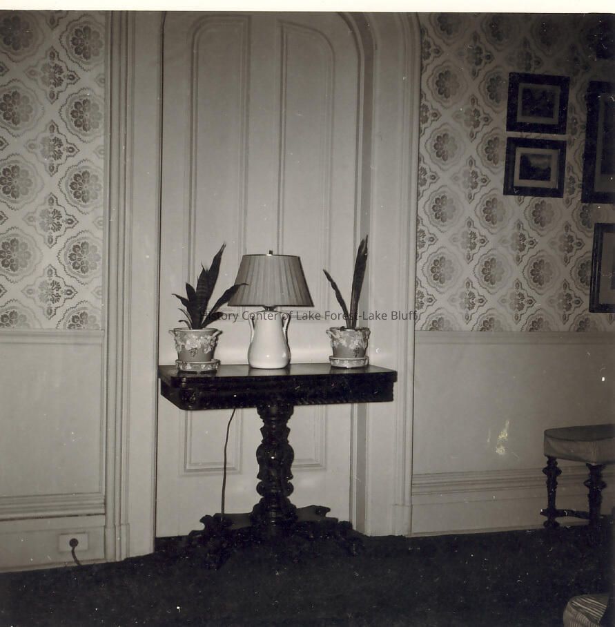 Interior image end table against door. The Evergreens; Address: 404 East Deerpath; Owners: Charles H. Quinlan; Simeon B. Williams; Captain Israel Parsons Rumsey; John Baker; Bruce Southworth; Built: 1859, 1870 361 East Westminster coachhouse