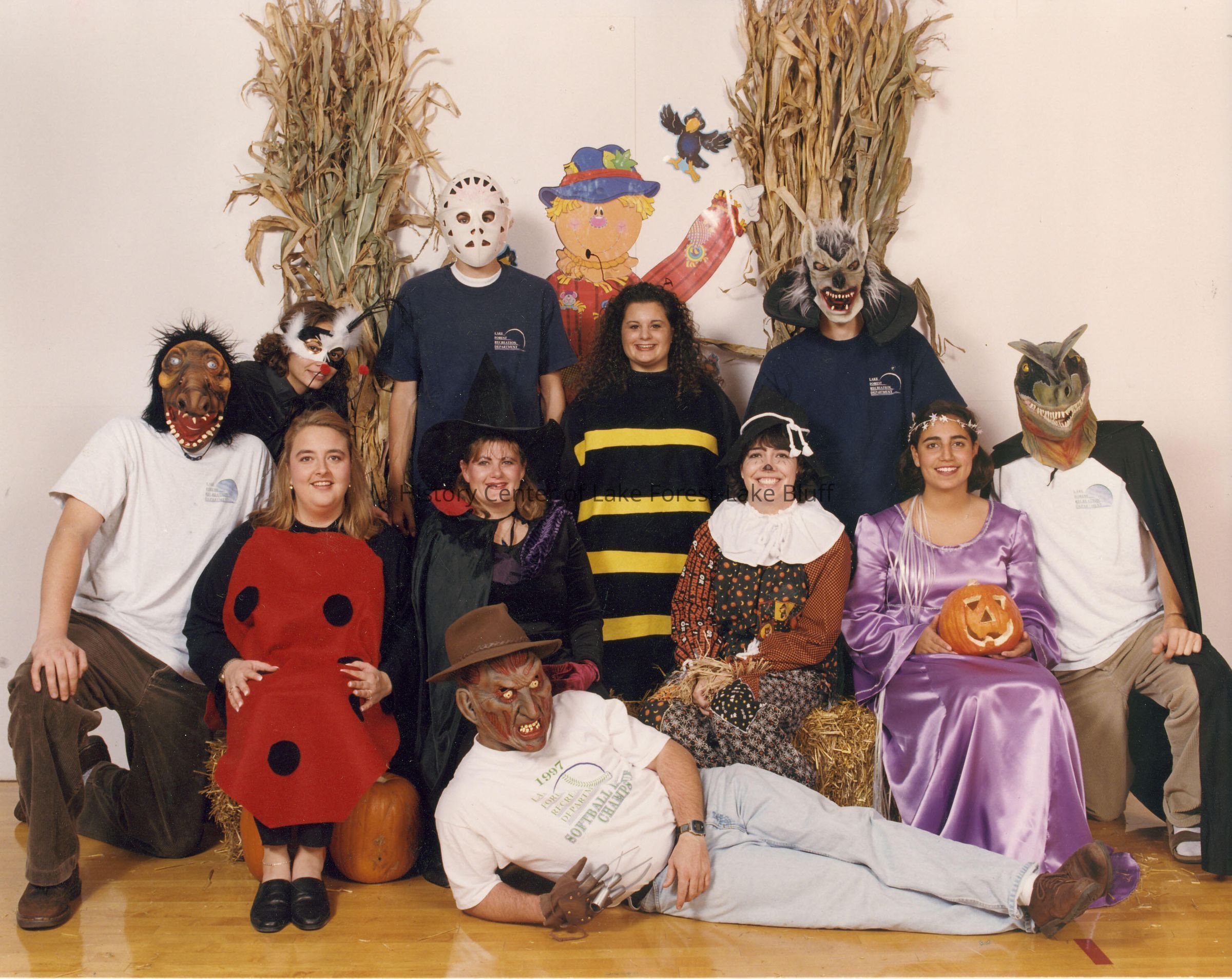 Group of 11 persons dressed in Halloween costumes. looks like 6 girls and 5 boys. not sure what they resprent- staff? volunteers? youth advisors?