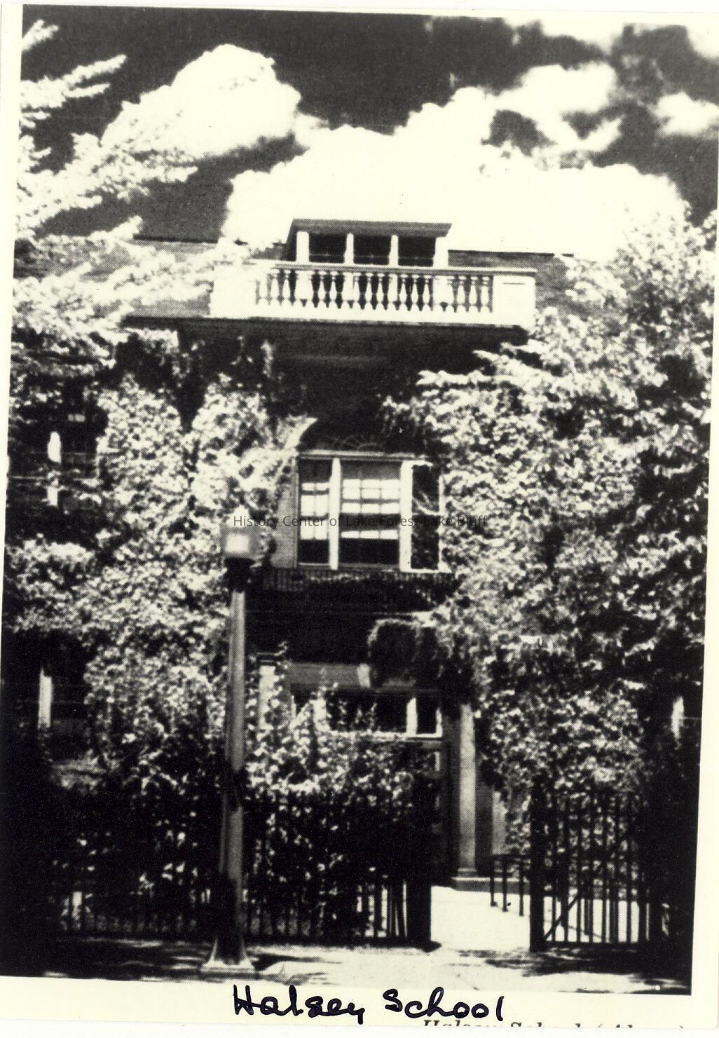 Black and white. Halsey School Exterior, front entrance