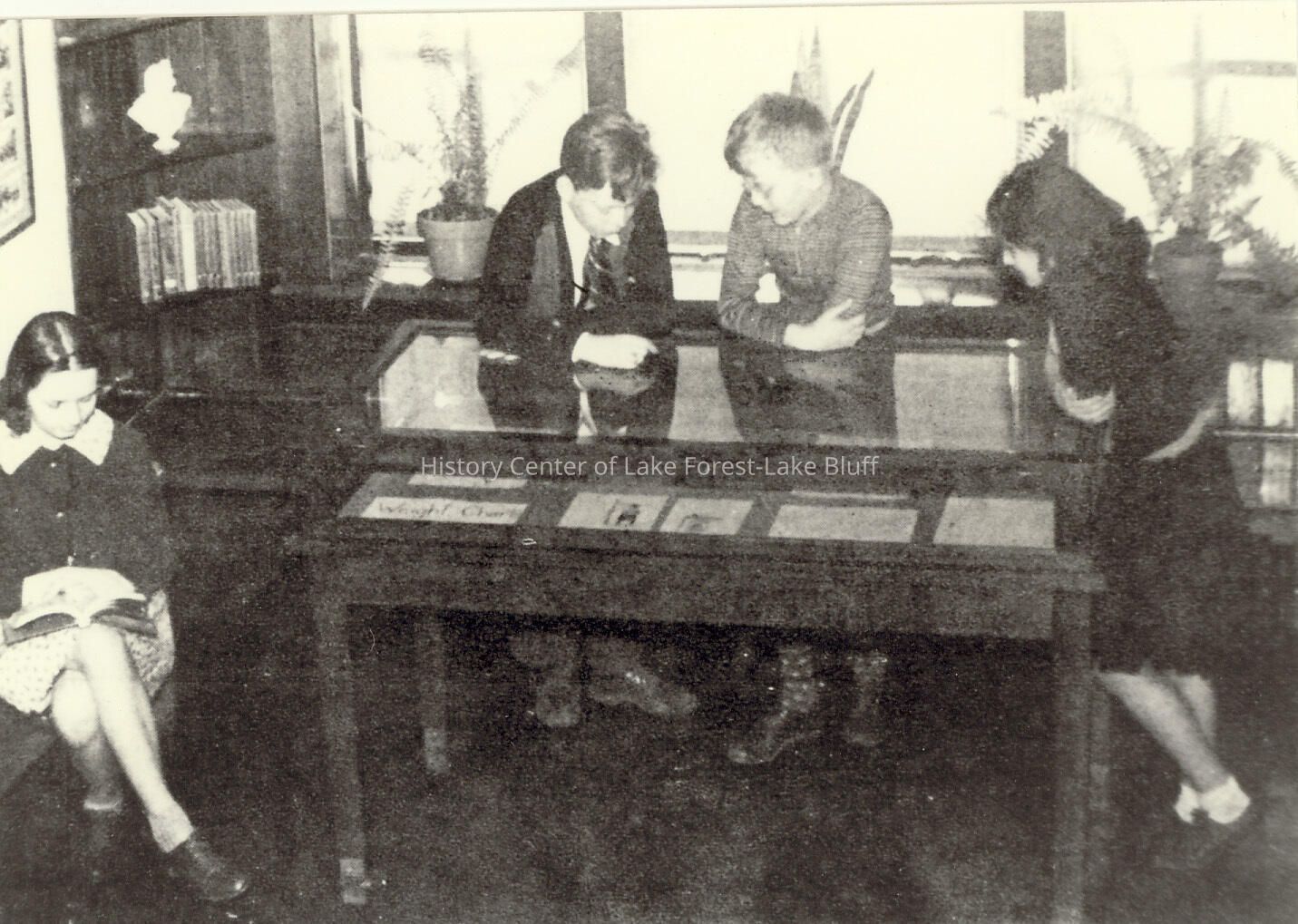 Halsey Library "Cosey Nook" 4 students looking at a display case Rose Mary Emma, Gordon Neale and Letra Bailey