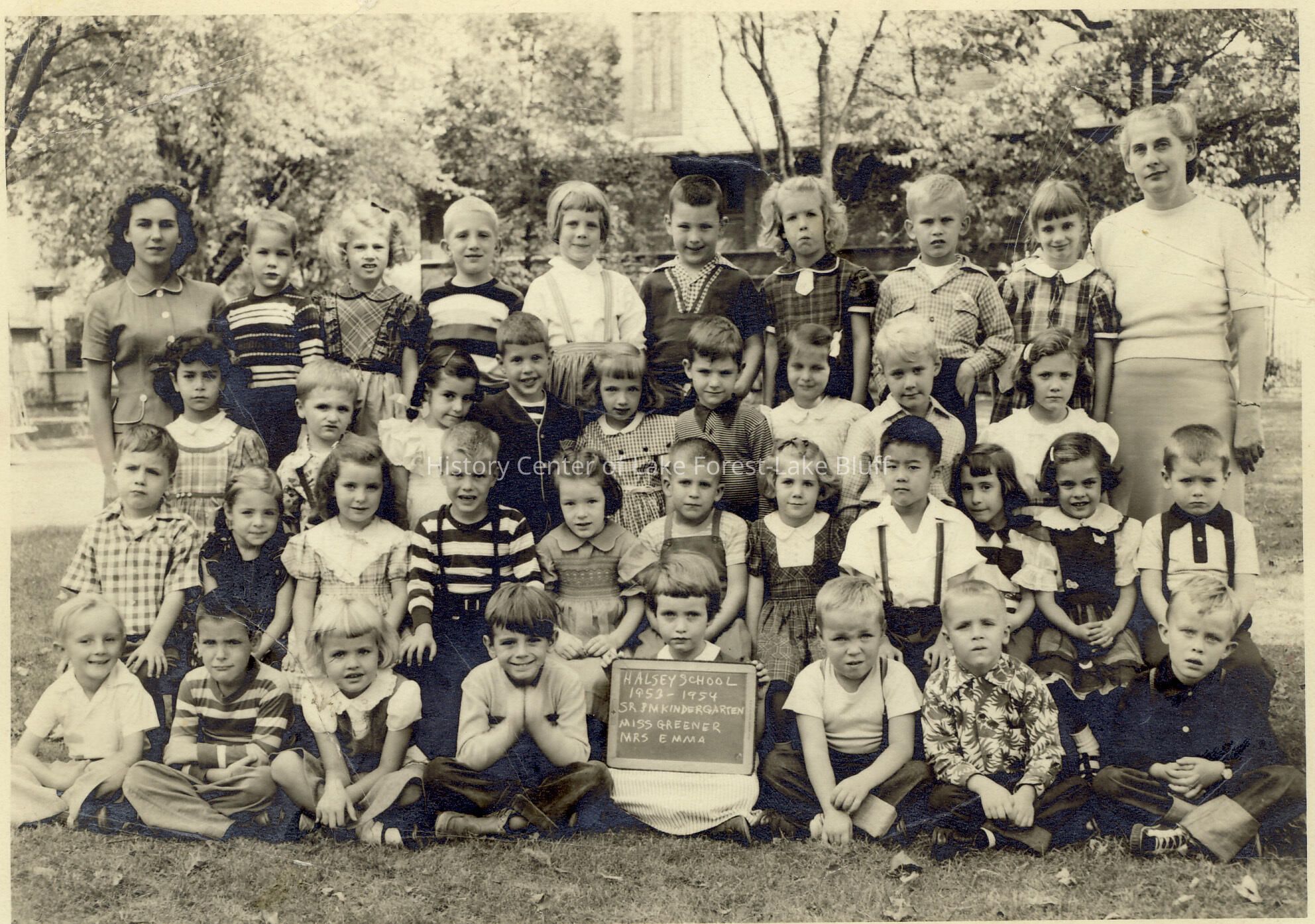 1953-1954 senior PM Kindergarten, class picture from Halsey School. Miss Greener and Mrs. Emma, teachers
