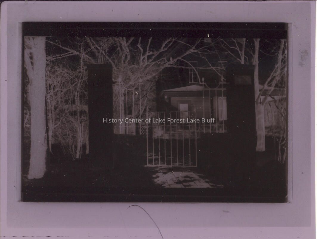 two -story white clapboard structure with two pillars and iron gate in foreground: negative image