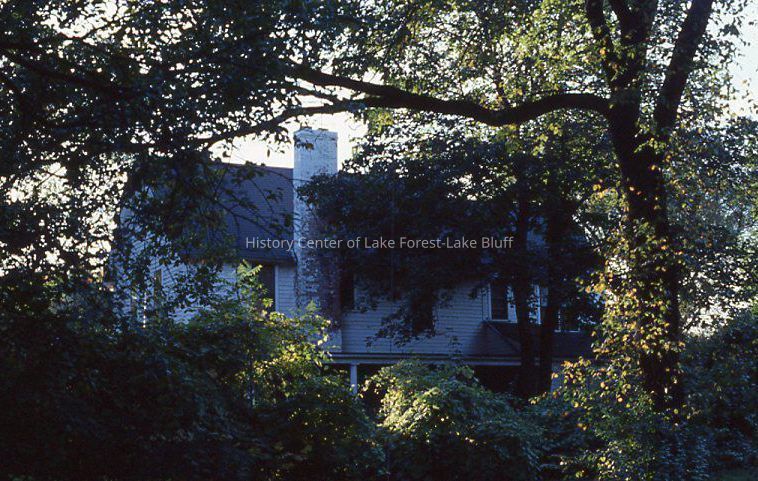 The image shows a house nestled among dense trees in a serene, shaded woodland.
