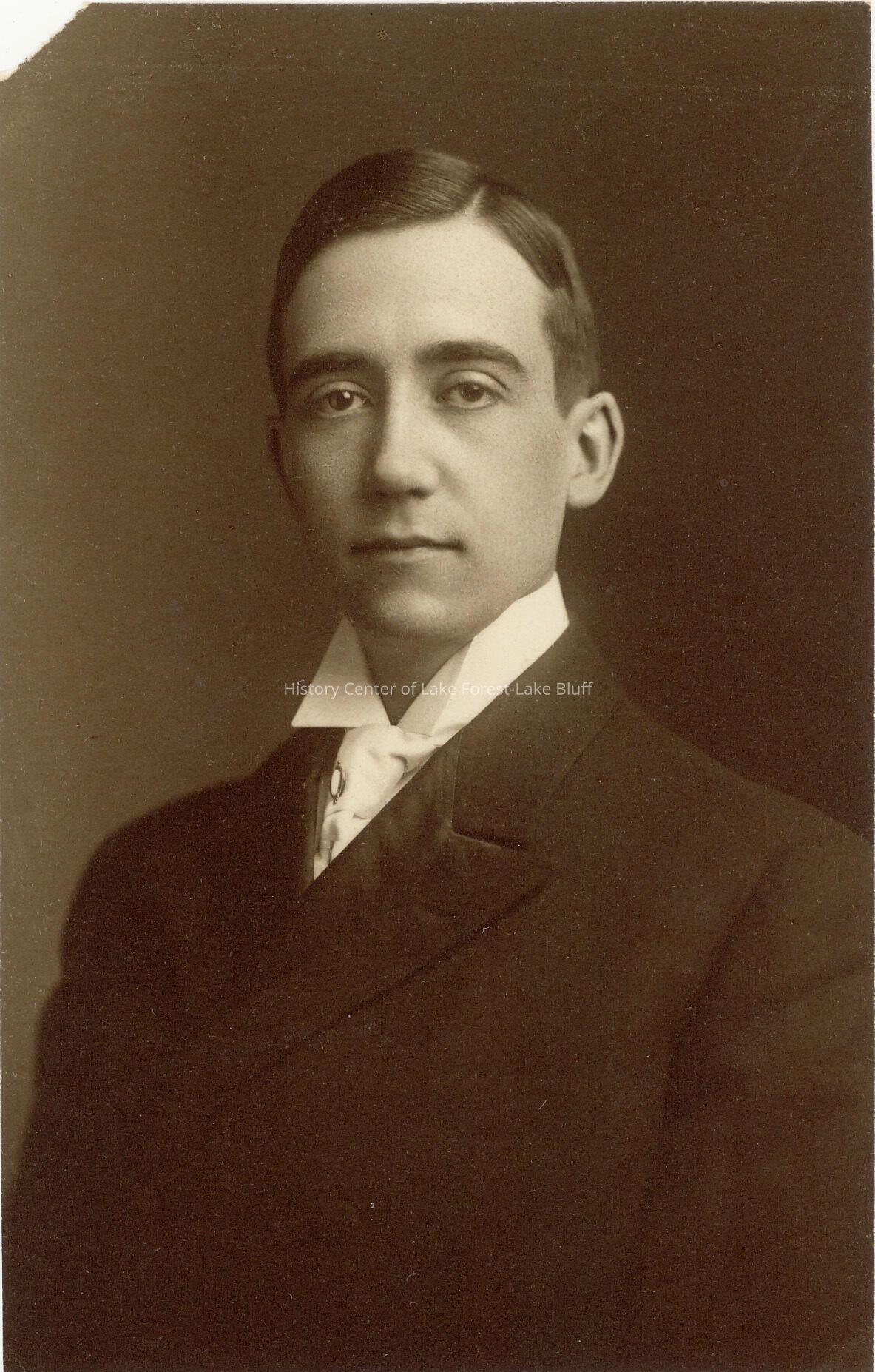 A formal shot of a young man dressed in a dark suit with a high collar and tie. see also 2004.20.119, same person in different attire Harvey Family member of Lake Bluff ?