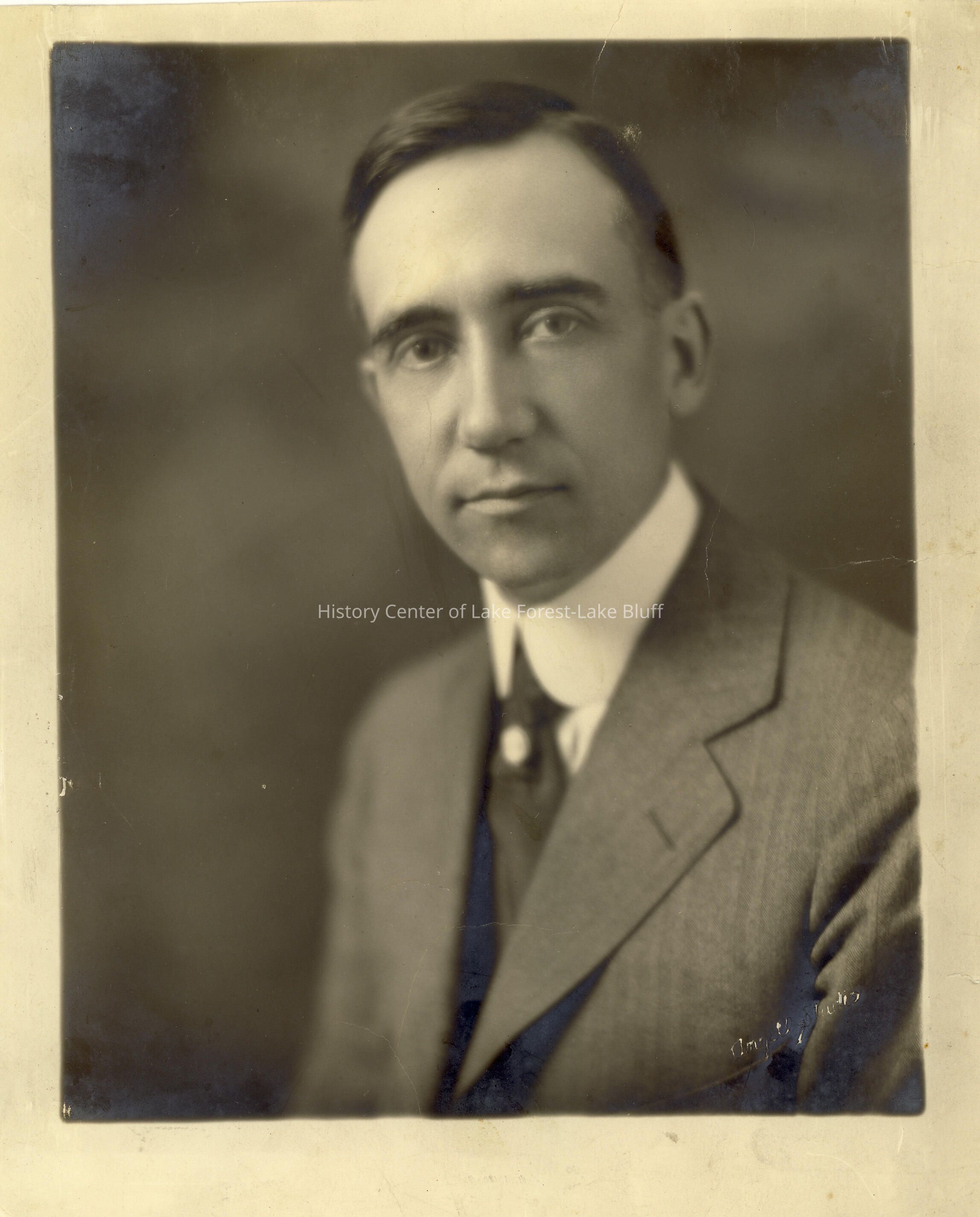 An 8x10 portrait of a man dressed in a pinstripe suit and dark tie with an oval tie pin. Harvey Family member of Lake Bluff ?